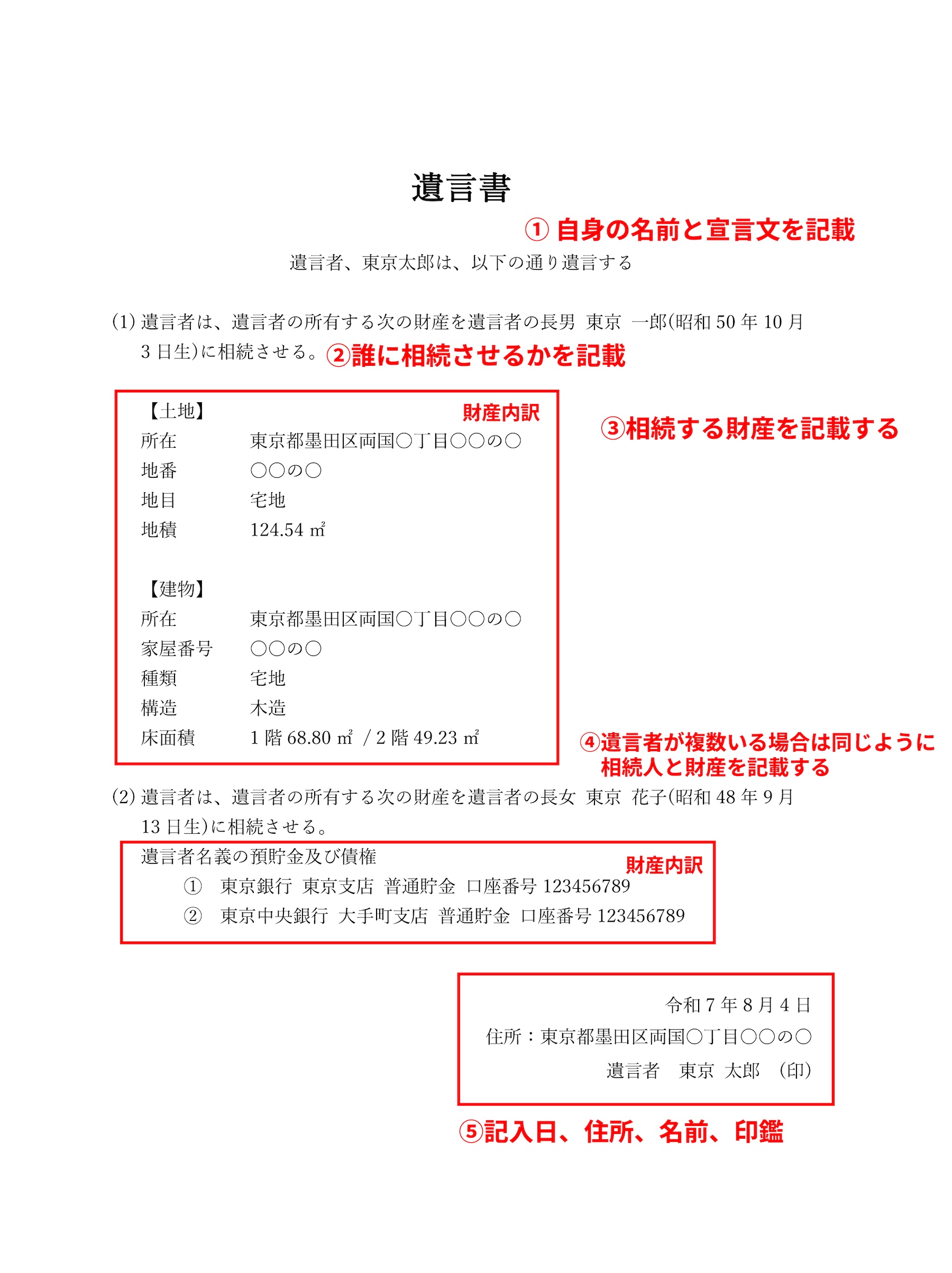 財産を、『誰に』『何を』『どれだけ』相続(遺贈)させるのかを、『誰が見ても誤解しない表現で記載』します。どのようにでも解釈できる表現は、やめましょう。