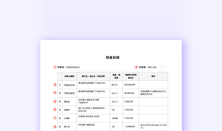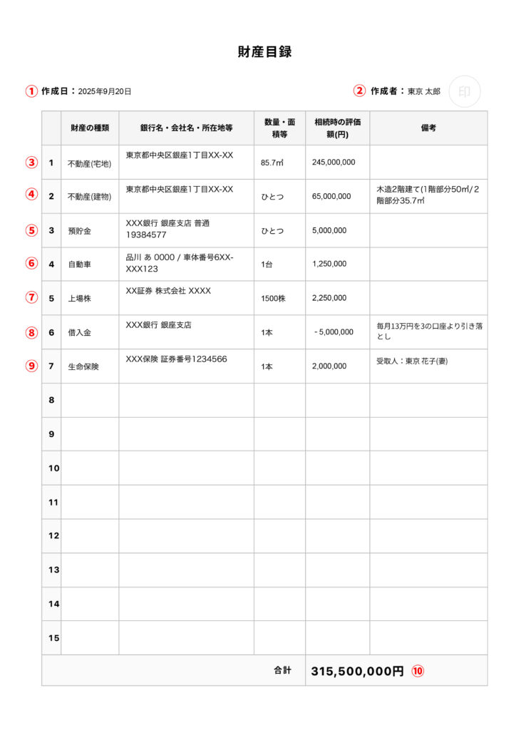 『雛形あり』財産目録の作成方法。オンラインで財産目録を作成できます。