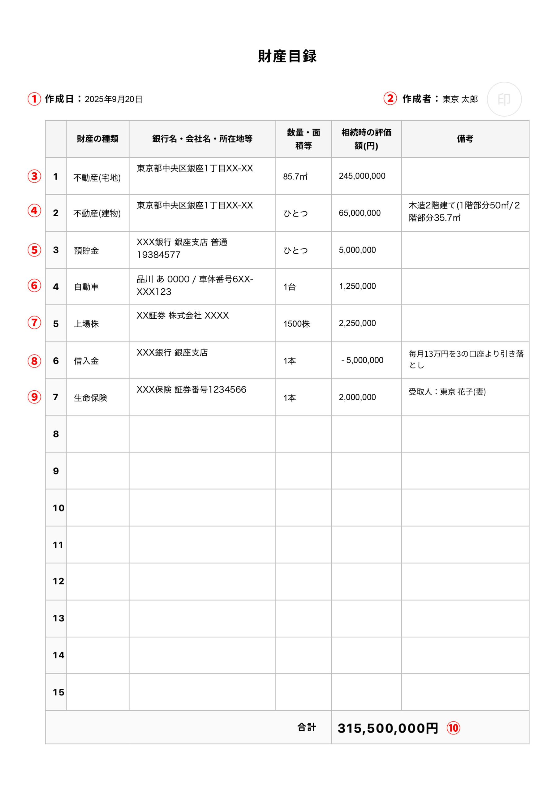 『雛形あり』財産目録の作成方法。オンラインで財産目録を作成できます。